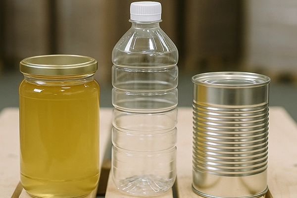 Glass jars, metal cans, PET bottles, doypacks, and bulk (bag-in-drum/totes). Sizes depend on the product category.